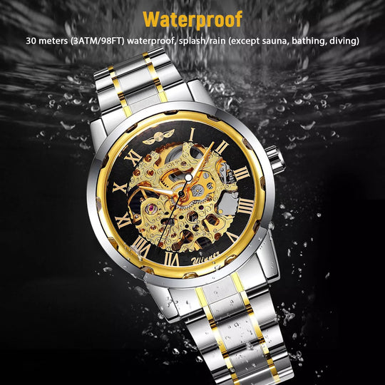 Men's Luxury Skeleton Automatic Mechanical Watch, Gold Tone Stainless Steel Wristwatch