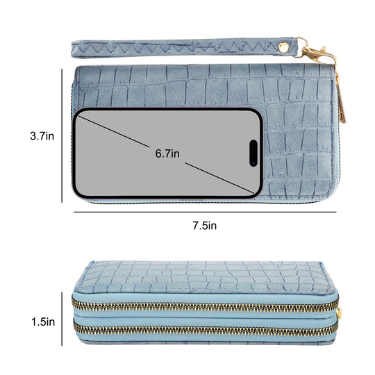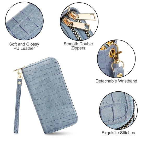PU Leather Wallet with Wristlet, Zip Around Clutch, Large Capacity Cell Phone Holder (Blue)