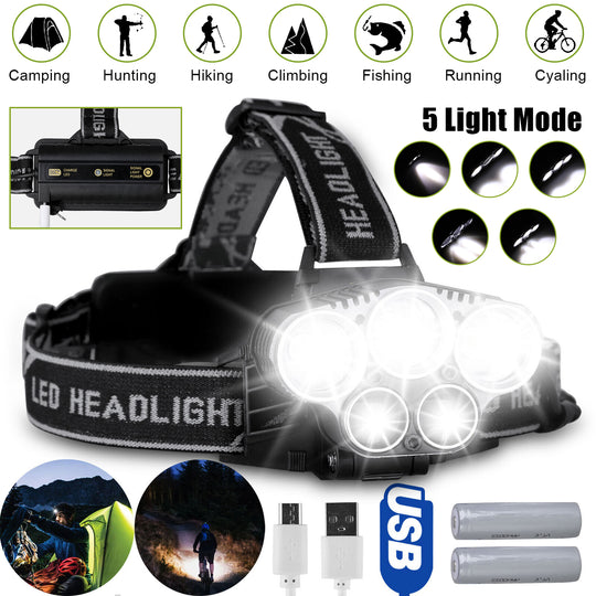 Rechargeable Headlamp, 5 LED Flashlight, 5 Modes USB, Waterproof, 8000 Lumens