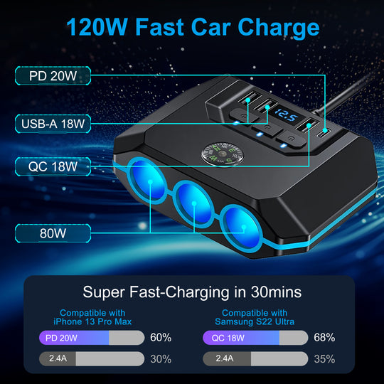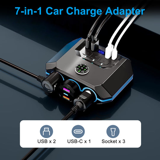 7-in-1 Car Charger Power Adapter - 3 Way Cigarette Lighter Socket Splitter with 4 USB Ports including PD and QC, LED Voltage Display for 12V/24V Vehicles