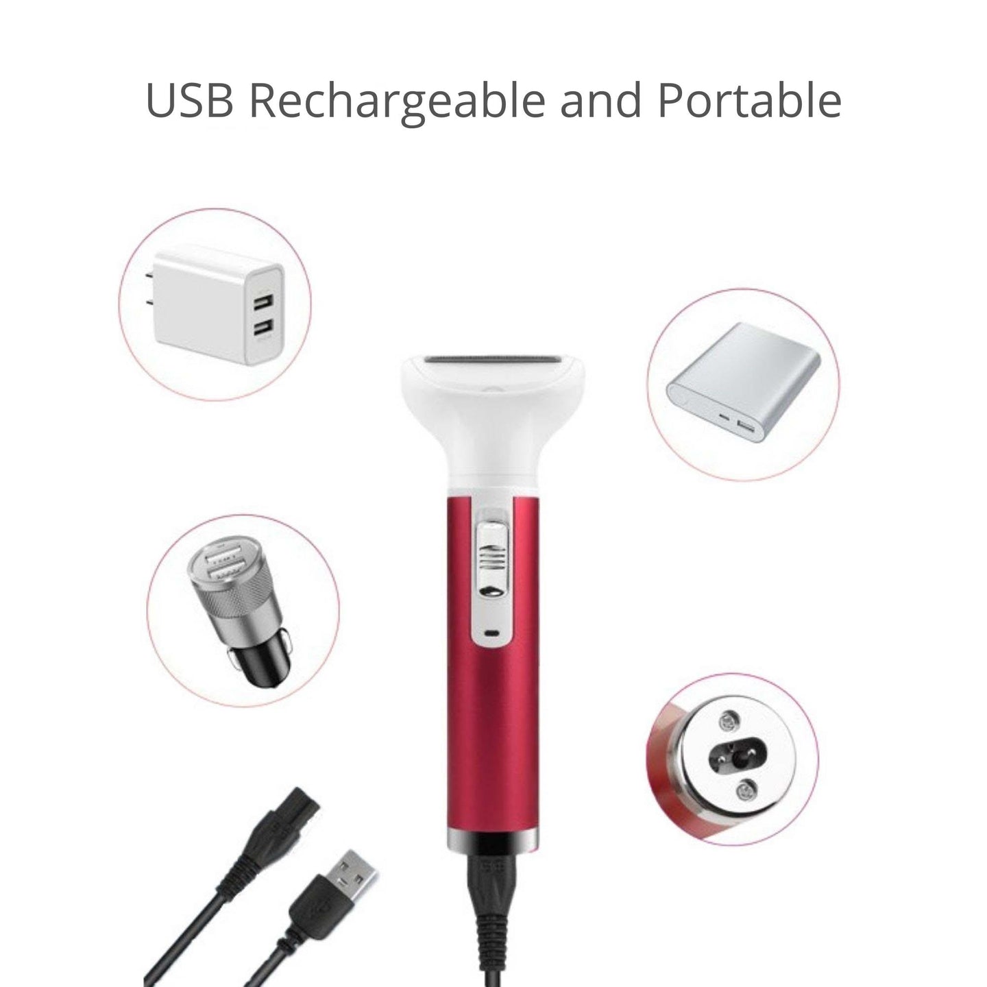 Our women's 5-in-1 cordless electric rechargeable shavers come with five head options that handle all your shaving and trimming needs for large and small areas, eyebrows, face, legs, armpit, etc. Its full range of motion makes it easy and comfortable to handle for the smoothest and painless shaving results. Our electric razor kit is the perfect tool for removing all kinds of unwanted hair, peach fuzz hair, underarm ingrown hair, stubble and residue hair, or thick hair. Its compact size and multiple head options make it your perfect go-to tool for nose hair trimming, leg shaving, pubic hair trimming etc.