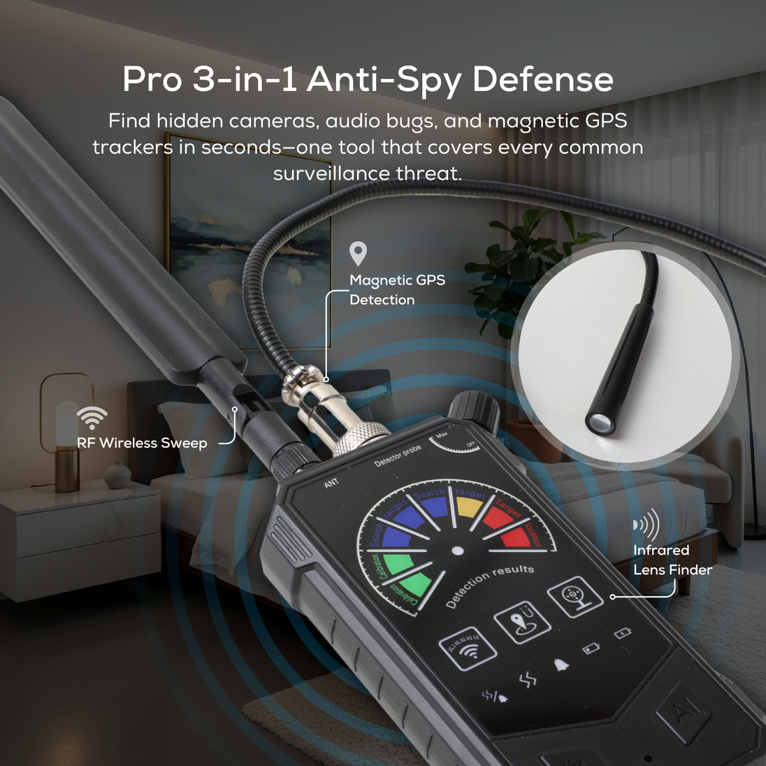 Experience total privacy protection anywhere you go with the CELECTIGO Hidden Bug and Camera Detector, a professional 3-in-1 security device built to uncover today’s most common surveillance threats. Combining a wideband RF signal sweeper, a 940nm infrared hidden camera finder, and a magnetic GPS tracker detector, this compact tool scans for Wi-Fi/4G/5G transmitters, pinpoint hidden lenses—even when powered off—and exposes magnetic tracking devices on vehicles or personal items. Powered by an advanced 9th-generation chipset for fast, accurate detection, it offers adjustable sensitivity, tone/vibration alerts, and reliable performance in homes, hotels, offices, rideshares, and cars.