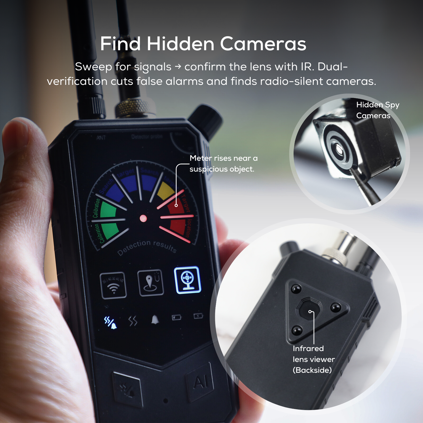 • 【Magnetic Tracker Hunter for Vehicles & Personal Gear】Are you worried about being tracked? Our powerful magnetic field detection mode is the answer. It instantly finds any device attached to your vehicle or property using a magnet, which is how most GPS tracker detectors operate. This essential feature gives you undeniable proof and allows you to immediately reclaim your security and confidential movements.
