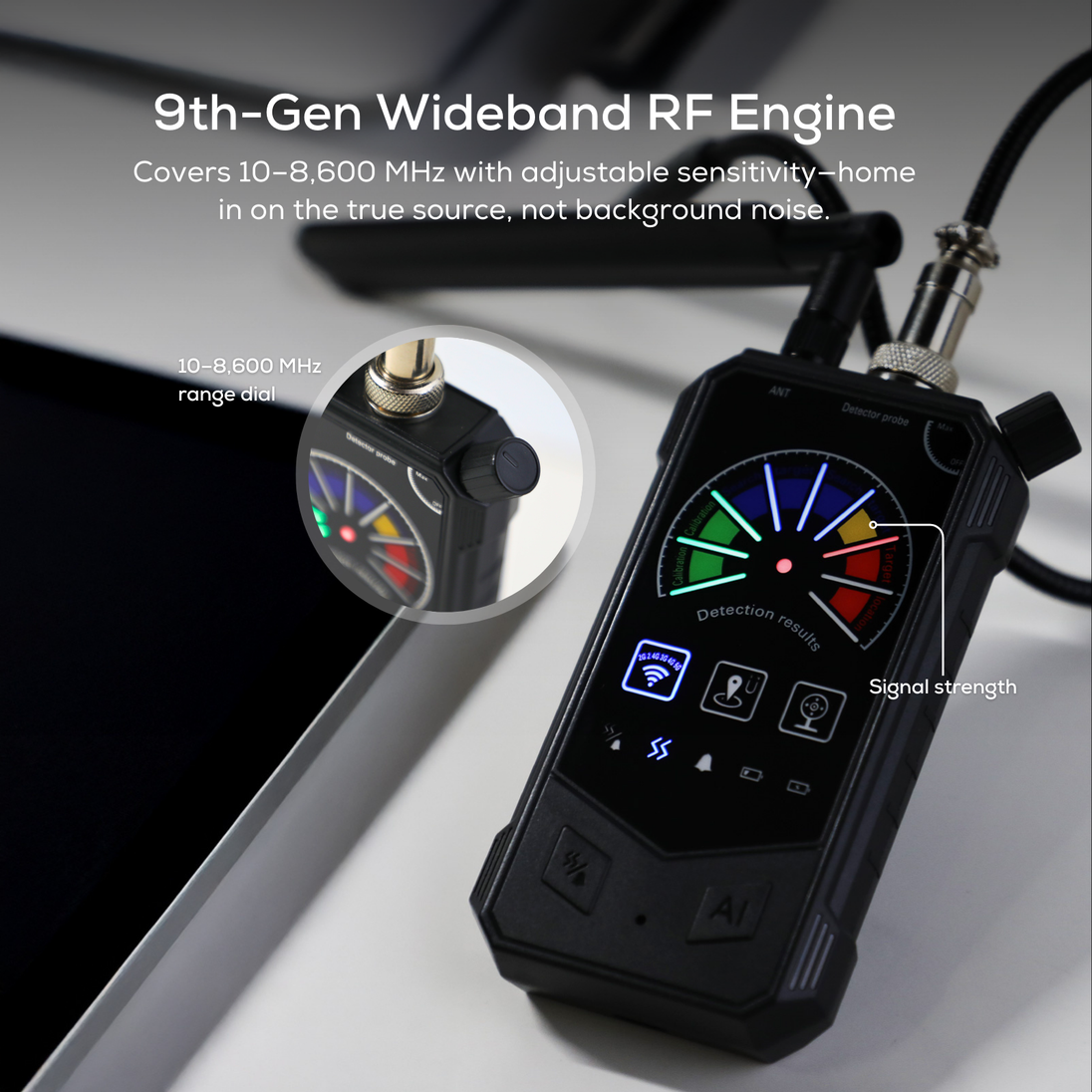 • 【Advanced 9th-Gen Wideband RF Engine for Faster, Smarter Sweeps】Our upgraded chipset scans 10 MHz–8,600 MHz to identify suspicious RF activity from wireless cameras or devices, audio hidden bugs, and beacons. Adjustable sensitivity isolates the true source so you can home in without chasing false alarms, while tone/vibration alerts guide you to the exact spot.