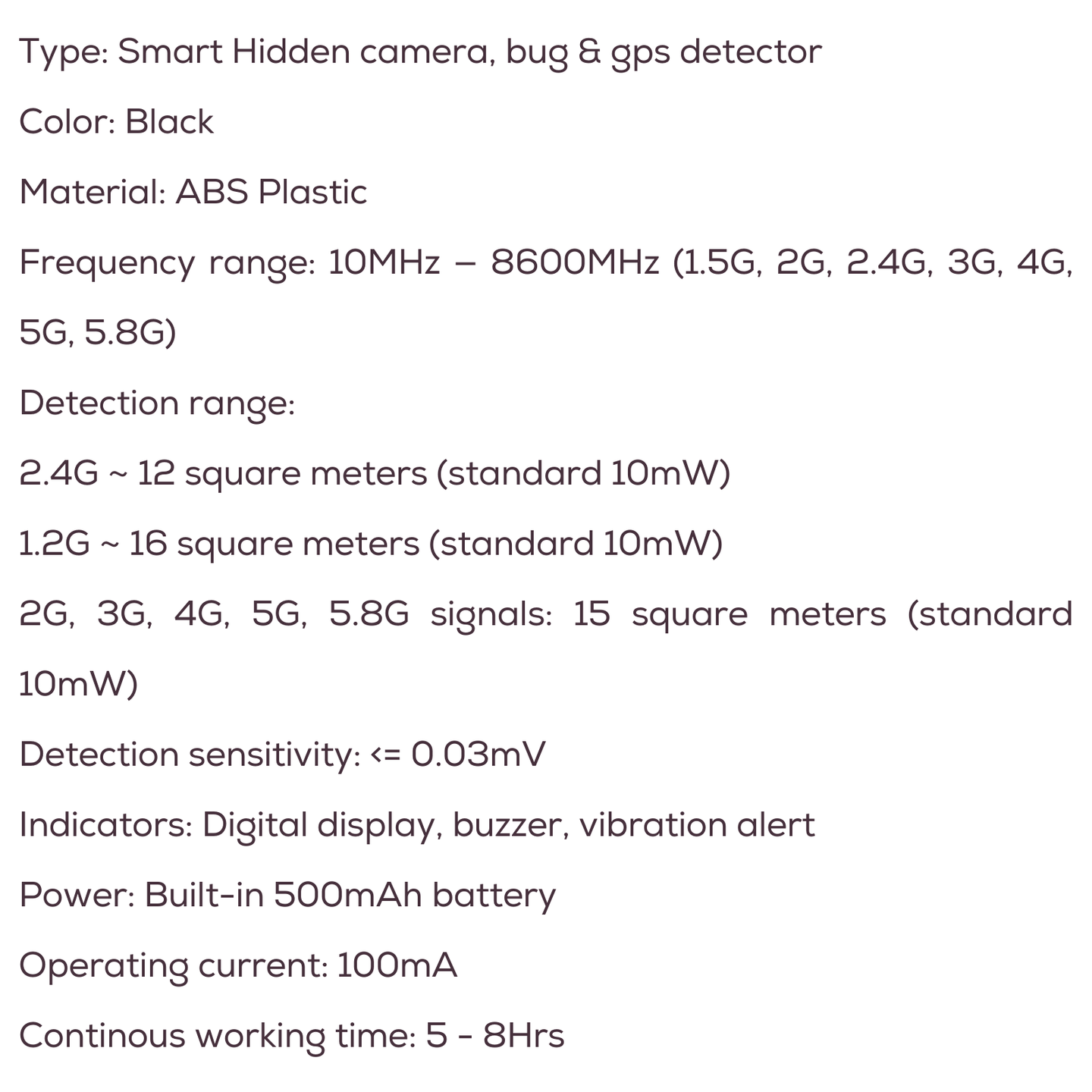 • Product type: Hidden camera, audio bugs and gps tracker detector